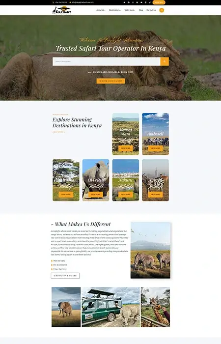 This one was built for a Kenyan safari tour operator looking to stand out in a competitive space without overcomplicating things. The first thing we focused on was trust—real wildlife imagery, a direct headline, and a clear booking CTA front and center. The tours are broken down by destination, not just names, so people actually know where they’re going. Each section leads with intent—short, focused, and built to get clicks without forcing the user to scroll endlessly.